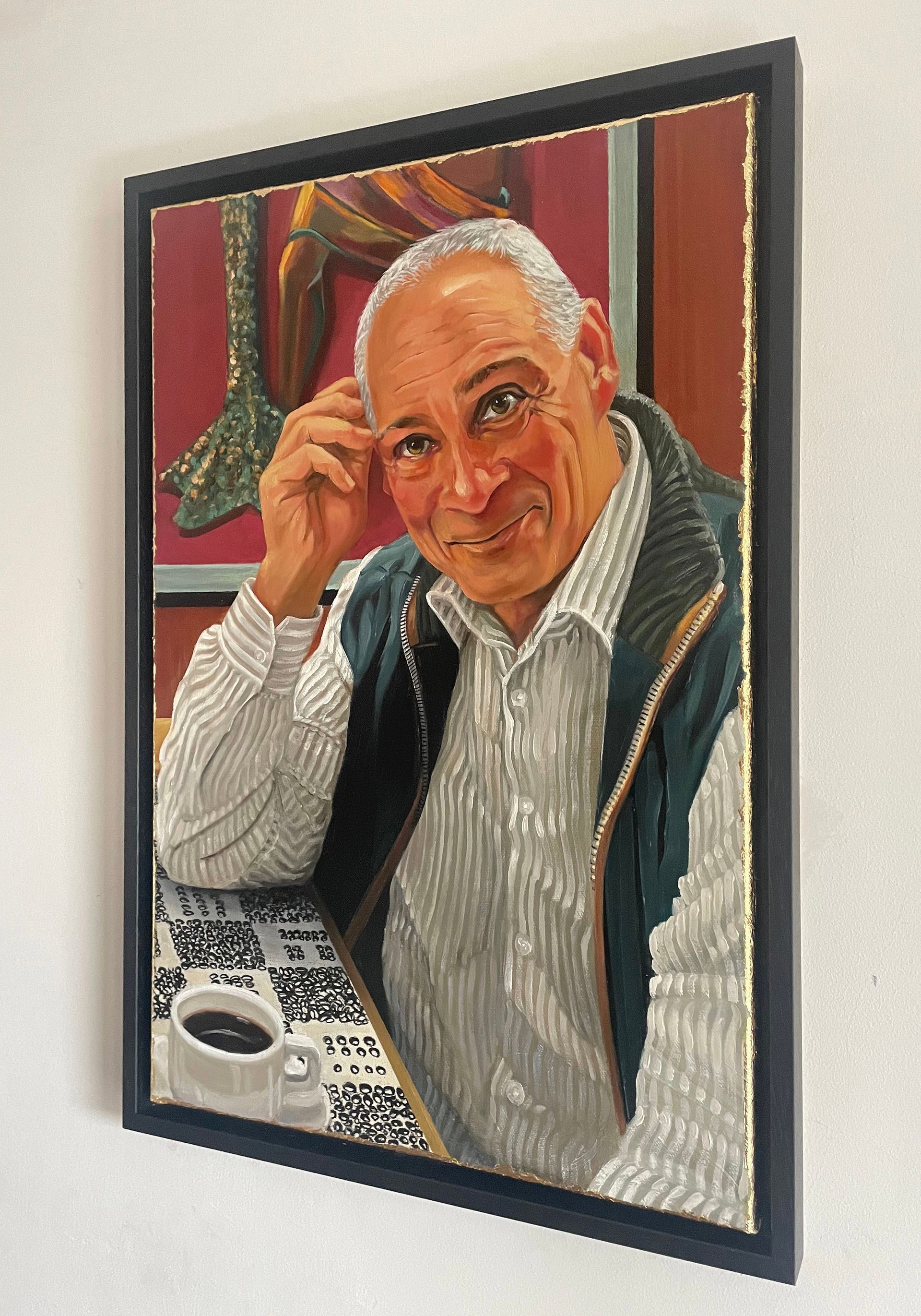 The portrait of currrent patron Marcus Luporini features the distinctive Formica tabletops and a section of one of the inset copper sculptures that decorate one wall. Their signature coffee also makes an appearance. I used a cup of their house blend coffee (our favourite for many years) to underpaint the portrait making it an integral part of the composition.