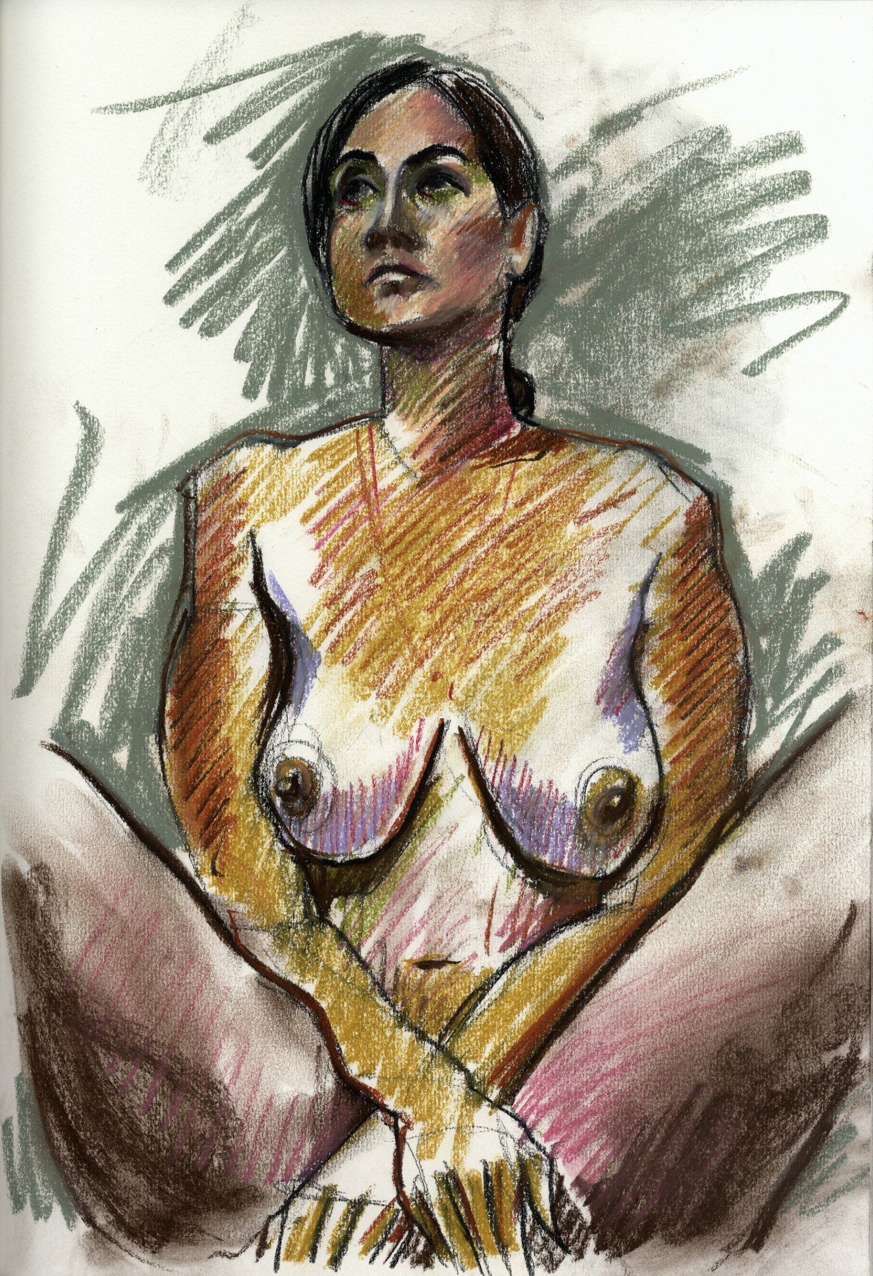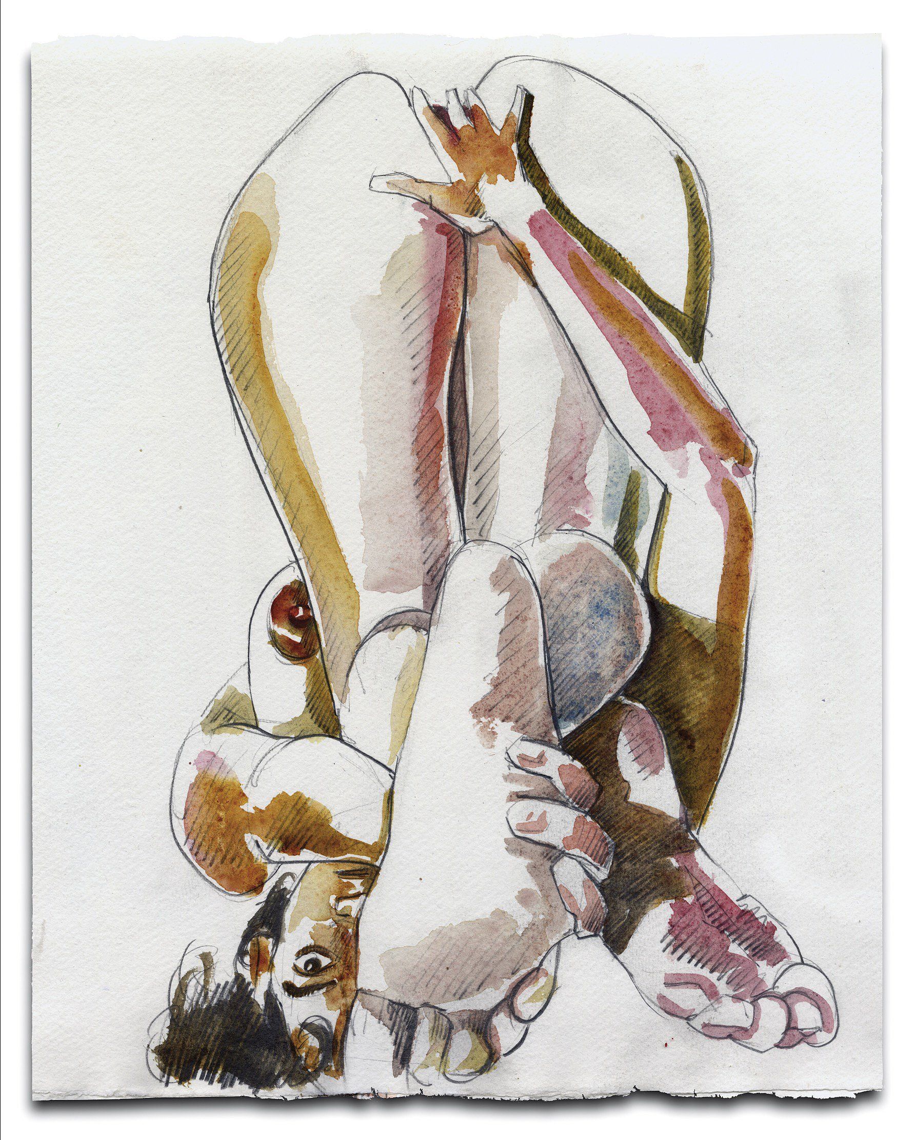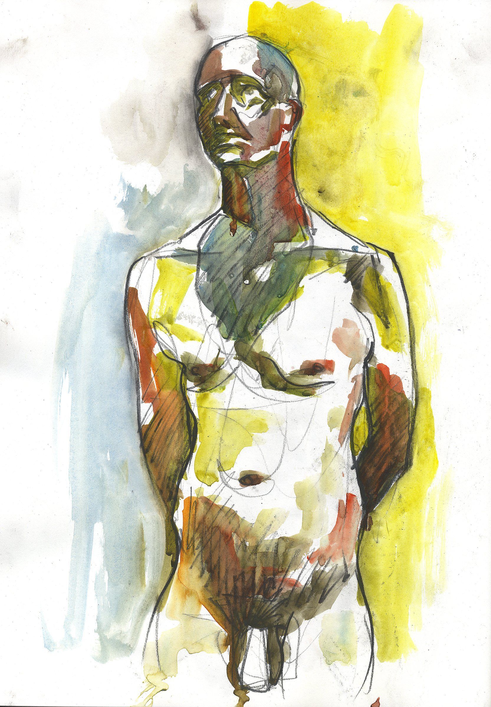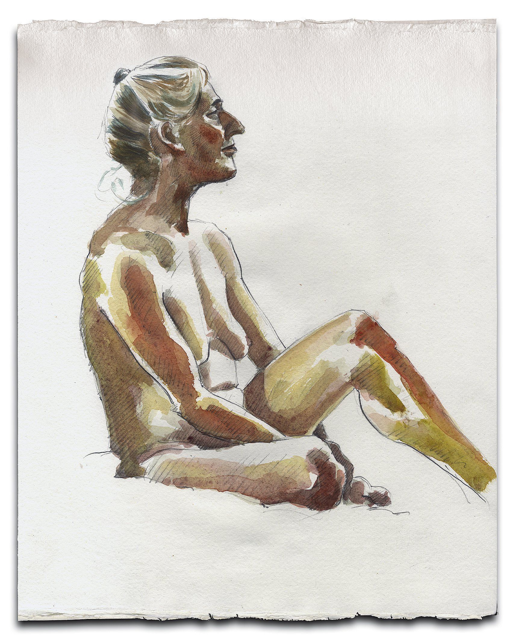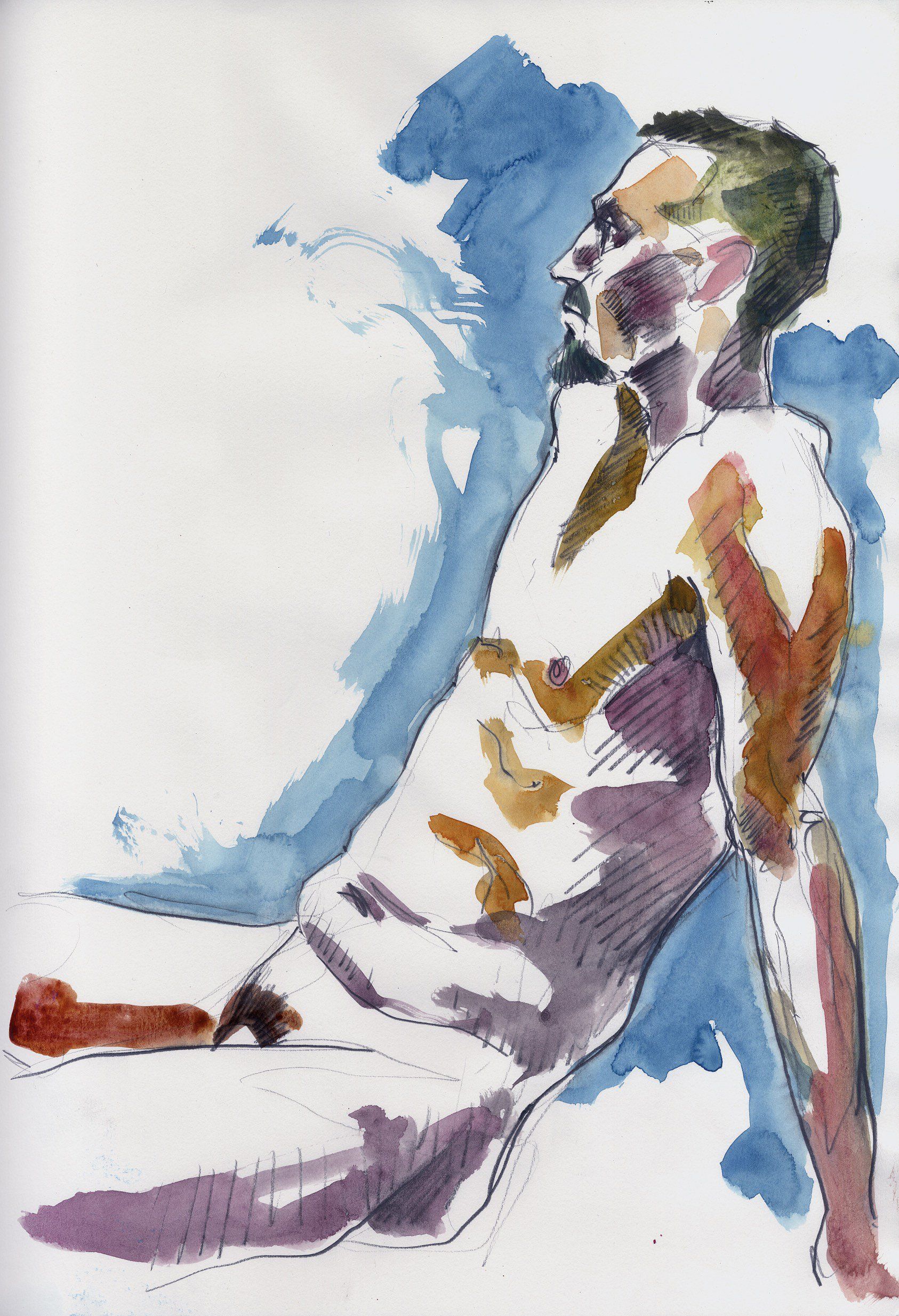 Contact me to arrange a one hour session where I will make up to five drawings of you in poses of your choice. This comprises some warm up sketches of five to ten minutes, followed by a longer twenty five minute painting. I then post the resulting unframed work to you.